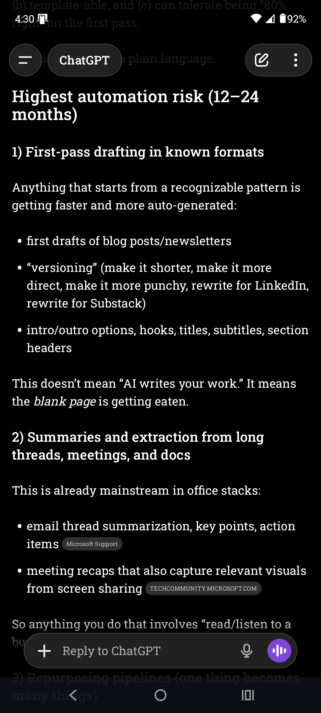 The prompt introduces mechanism and references adoption trends. It extends the time horizon and removes the short-answer constraint. When I asked this in a new chat, I didn’t get reassurance, I got decomposition. What follows in the screenshot below is a small excerpt.